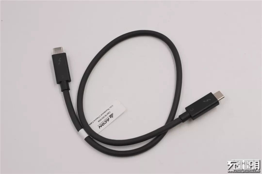 随机附赠了一条50cm长度的雷电3数据线,配合硬盘盒使用,由联展科技(ACON)代工。