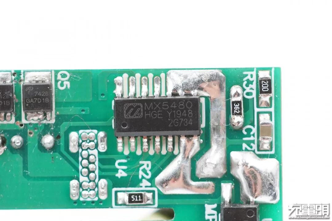我们再来看次级那颗表面丝印为MX5480的芯片,可以看出其内置同步整流控制器,已经同步整流功率MOSFET、以及USB-C口和USB-A包括PD3.0和其他私有快充协议控制器及执行A+C口交互工作的控制电路和端口模块,如此多的功能All in on 在一个SOP-14里面,外围引脚如此少的情况下完成A+C口的所有功能,其当属目前业界集成度最高、外围最简洁的可量产USB PD快充 A+C解决方案,产品系统整合设计能力的进步也可看出美思迪赛半导体这几年在数模混合技术设计上的坚持和积累。