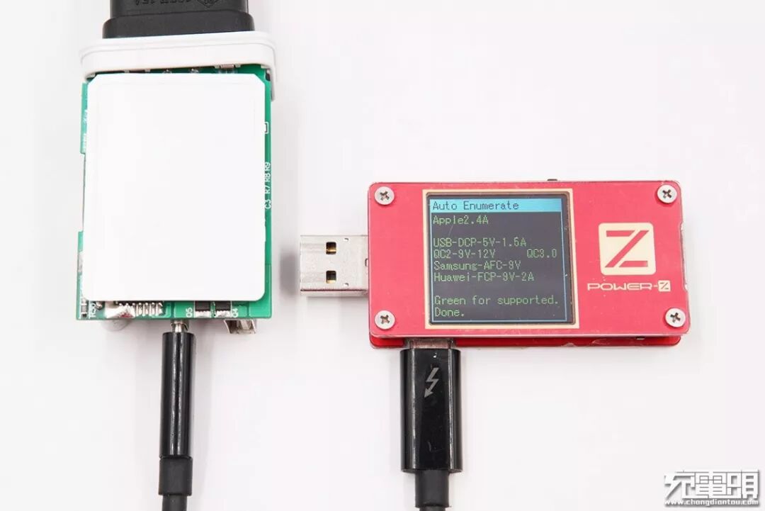 当两个接口同时输出时,输出电压自动将至5V;当其中一个接口的负载移除之后,另一个接口又可恢复至快充状态。从对协议协议的兼容性测试来看,这套芯片对协议的支持还是挺不错的。