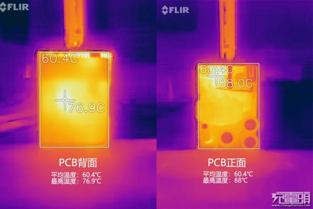 实测该套方案在40W满载功率下,经过150分钟(2.5小时)的老化测试后,PCB正面和背面的平均温度均为60.4℃左右;背面的最高温度出现在初级芯片对应的位置,约为77℃,正面的最高温度出现在次级芯片对应的位置,约为88℃。测试结果看起来温度表现果然还是非常不错的。