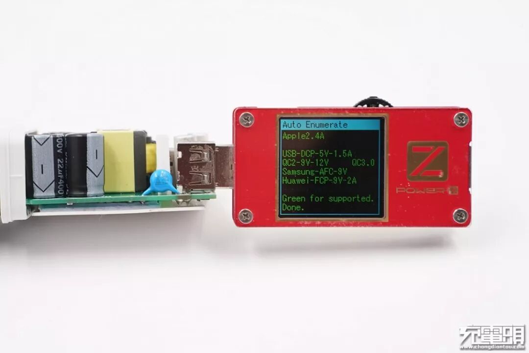 USB-C口同样支持Apple 2.4A、USB DCP、QC2.0、QC3.0、AFC、FCP等协议。