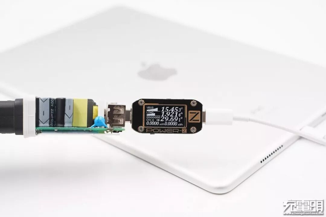 当使用这套方案给iPad Pro(11寸)充电时,显示电压15.44V,电流1.71A,充电功率约26.4W,成功开始USB PD快充,充电功率达到正常水平。