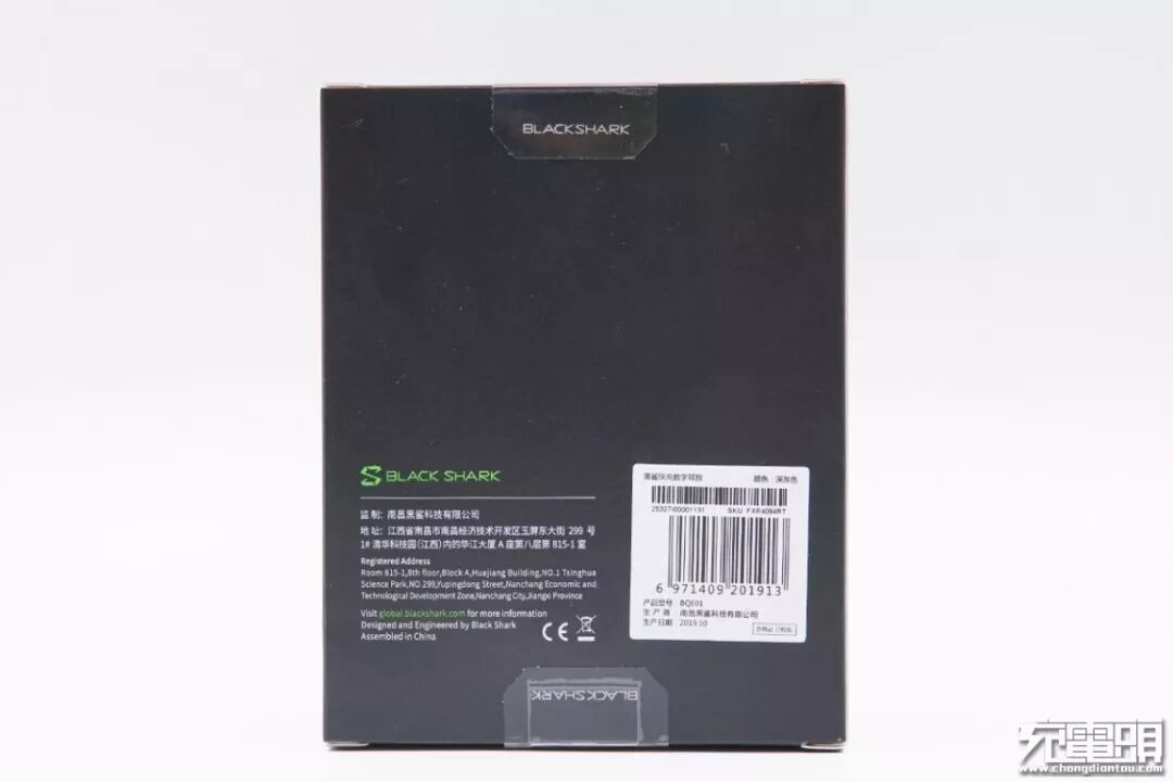 两端粘有透明胶带,上面印有“BLACKSHARK”字样,下端标注有产品参数规格等信息。