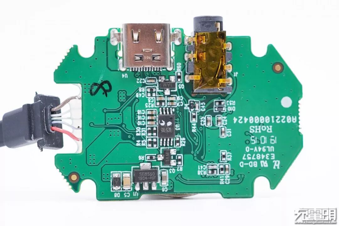 PCB板特写,元器件集中分布在中间位置,能够较好的缓冲外部冲击,如不慎摔落。耳机插孔外壳上贴有绝缘胶带。