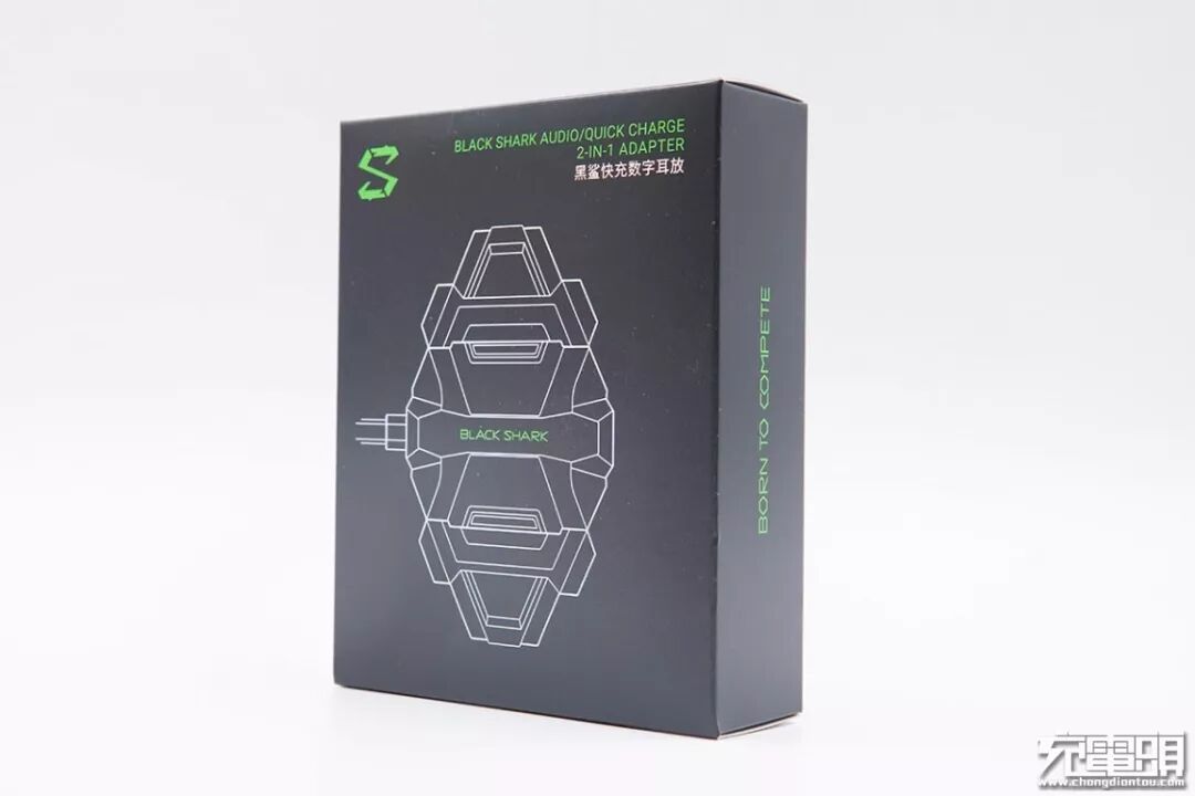主图黑色的外包装纸盒,正面是产品的简图,左上角是“S”logo,右上角是产品名称——黑鲨快充数字耳放。