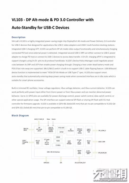 威锋电子VL103,是一款高度集成的节能单芯片DisplayPort Alt-mode和USB PD 3.0控制器,适用于USB-C设备,专为USB-C视频适配器和USB-C多功能扩展坞等应用而设计,目前已获得USB-IF协会PD 3.0认证,此前已被华为USB-C转HDMI高清投屏线采用。