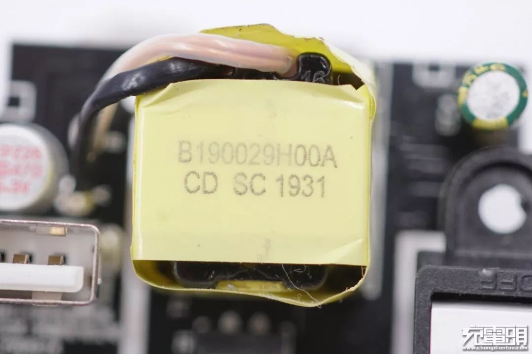 黑色PCB板上初级次级分界明显,之间使用“L”型黑色绝缘板进行隔离,开关两端使用固定柱固定在壳体上。输入端上有初级滤波电解电容、工字电感、延时保险丝、变压器、PWM主控芯片供电电容等元器件;输出端是蓝色Y电容、两颗输出滤波固态电容、3个USB-A接口。