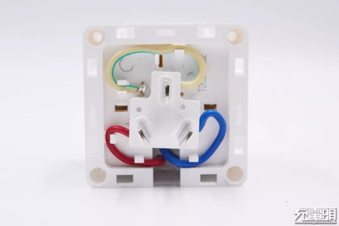 交流插孔板通过卡扣固定在上下两块塑料板之间。另外两块交流插孔板也是同样的固定设计。