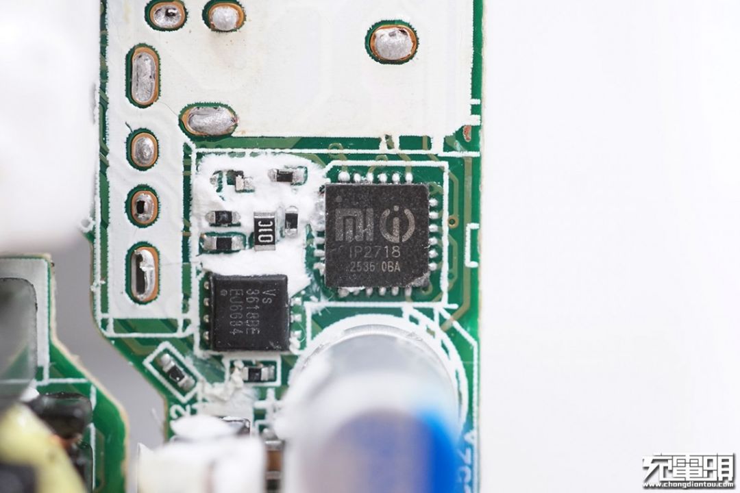 小米这款30W快充充电器用到的协议芯片丝印了小米和英集芯两家品牌的logo,型号IP2718。据了解,该芯片由小米与国内知名芯片品牌英集芯联合定制;也正是通过这颗高度定制化的芯片,小米30W快充充电器的USB-A接口才得以具备USB PD快充功能。