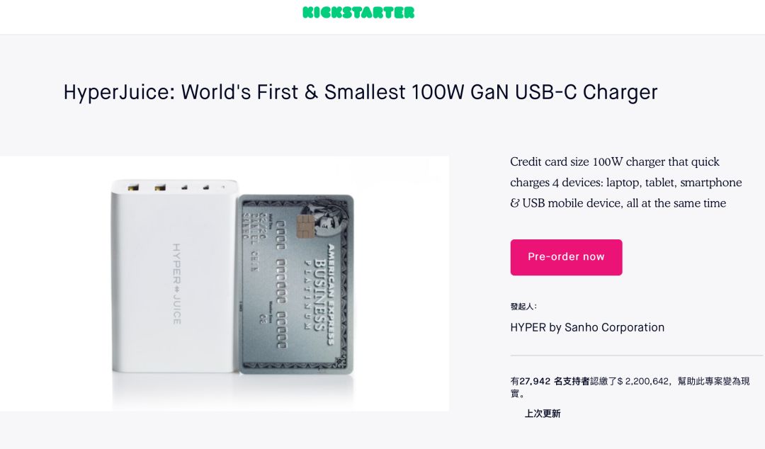 9、HyperJuice 的 100W 2C2A氮化镓充电器 众筹破千万