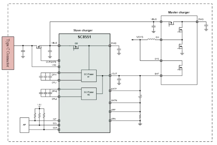 SC8551是南芯针对手机快充市场最新推出的电荷泵快充IC。作为国内首款高压电荷泵快充IC,SC8551还开创实现了高压快充和低压直充双模式充电功能。SC8551采用56pin的CSP封装,芯片尺寸为3.32mm*3.35mm。在充电过程中,SC8551作为主从充电架构中的从充电IC,在手机进入快充阶段后开始工作,其主要特点如下: