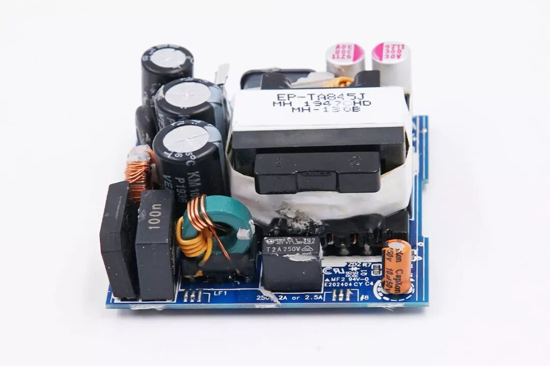 输出端设有两颗固态电容、USB-C接口以及蓝色Y电容。