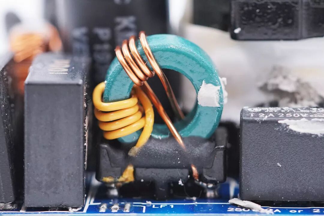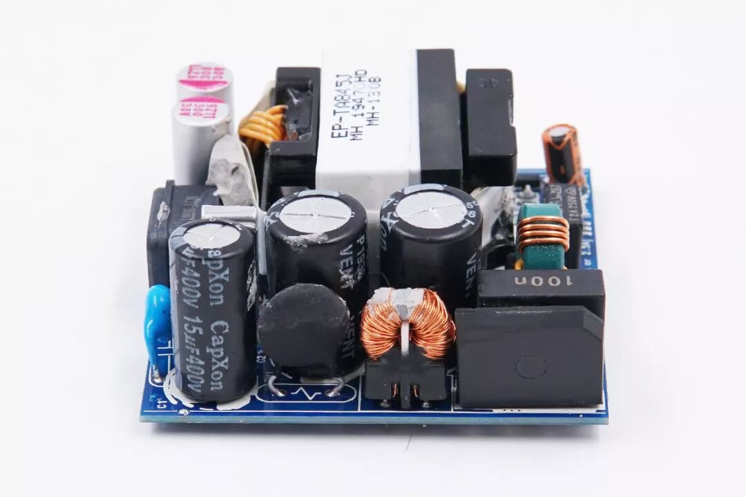 PCB板侧面一览,分别焊接有热敏电阻、共模电感和三颗初级滤波电解电容。