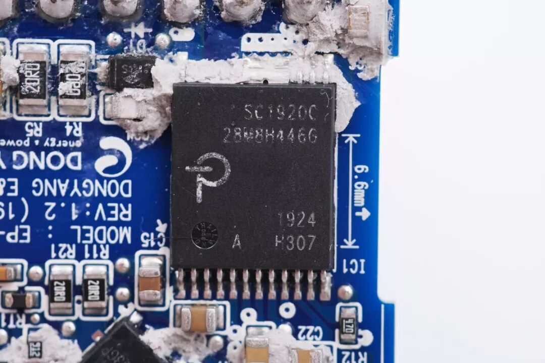 充电器的主控芯片为SAMSUNG三星向PI定制的料号SC1920C,属于InnoSwitch3-Pro家族。该芯片内置初级PWM控制器、初级开关管、次级同步整流控制器等。