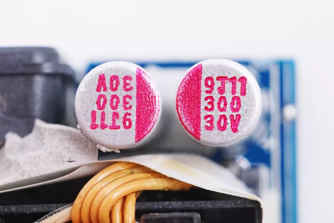 两颗输出滤波固态电容规格一样,均为300μF 30V,两颗并联。