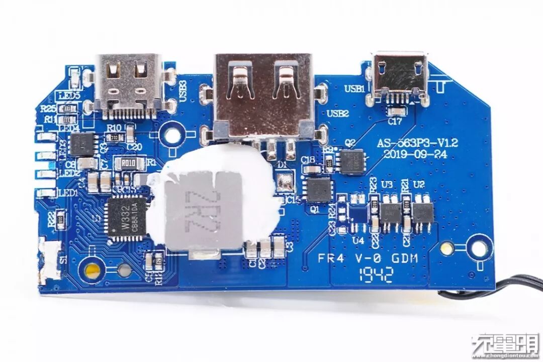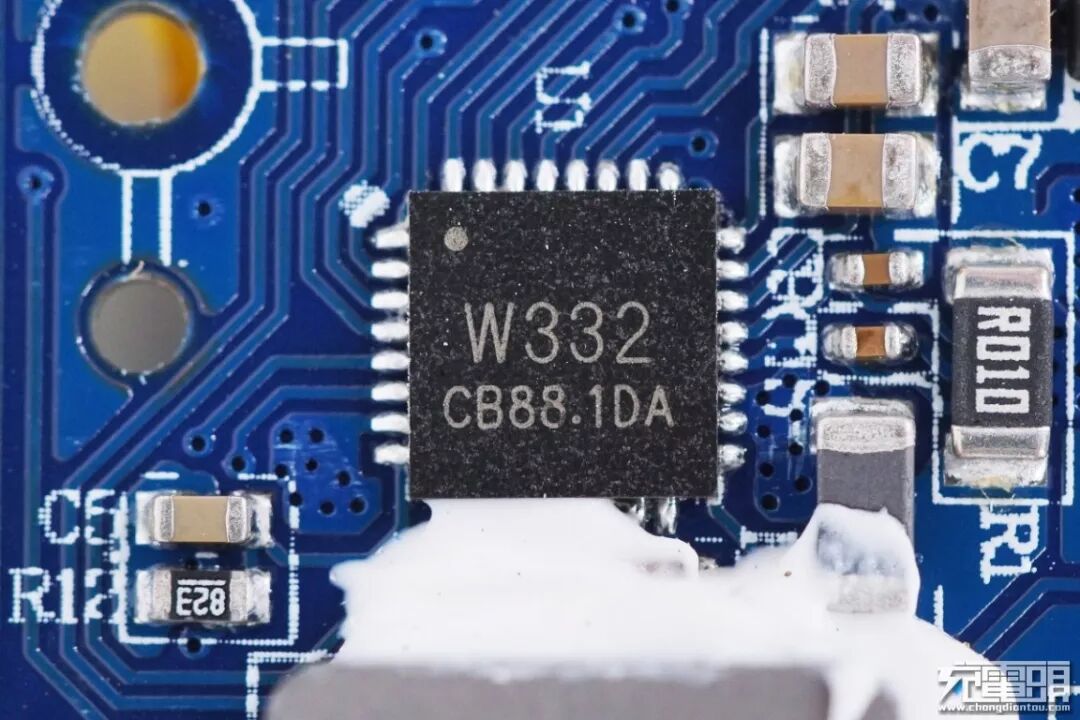 丝印W332芯片,经过查询,是英集芯的IP5332多合一SOC芯片,可同时支持多个USB口,并且均支持多种快充协议,集成双向PD功能,且支持多种电压电池,涵盖市面上所有锂电池,最大充电电流5A,最大支持18W输出,同时内置电量计功能,内置功率管,外围元件数量少,最大简化设计节省成本,芯片支持锂电池NTC温度检测,确保使用安全。