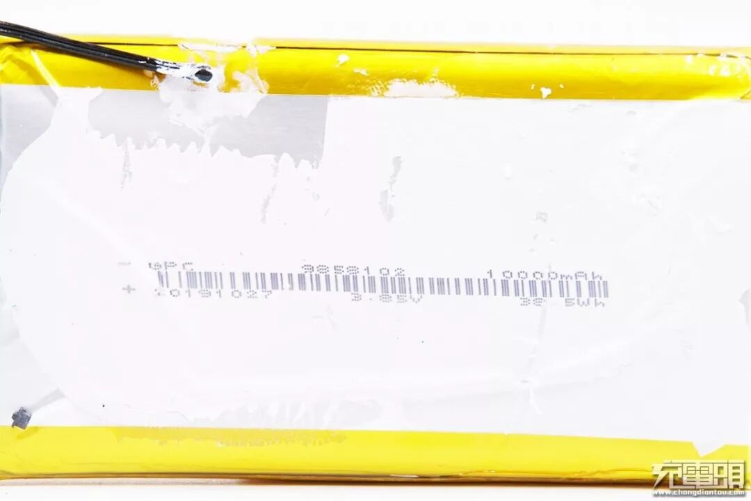锂聚合物电芯上印有参数:电芯来自GPC格林德,10000mAh 3.85V 38.5Wh,生产日期为2019年10月27日,日期新近。