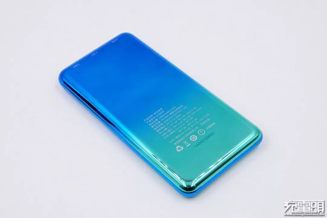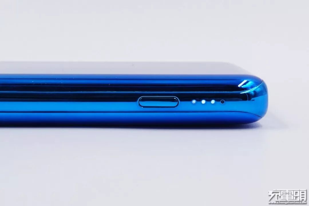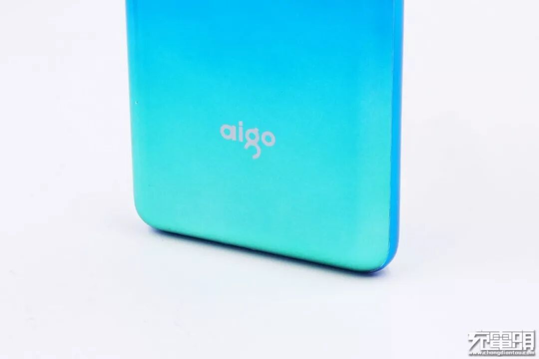 aigo这款双向快充移动电源采用PC阻燃材质外壳,表面进行亮面烤漆处理工艺十分光滑,侧身光滑弧面过渡,上手感好。光滑机身壳配上极光蓝颜色,产品整体看上去十分绚丽。