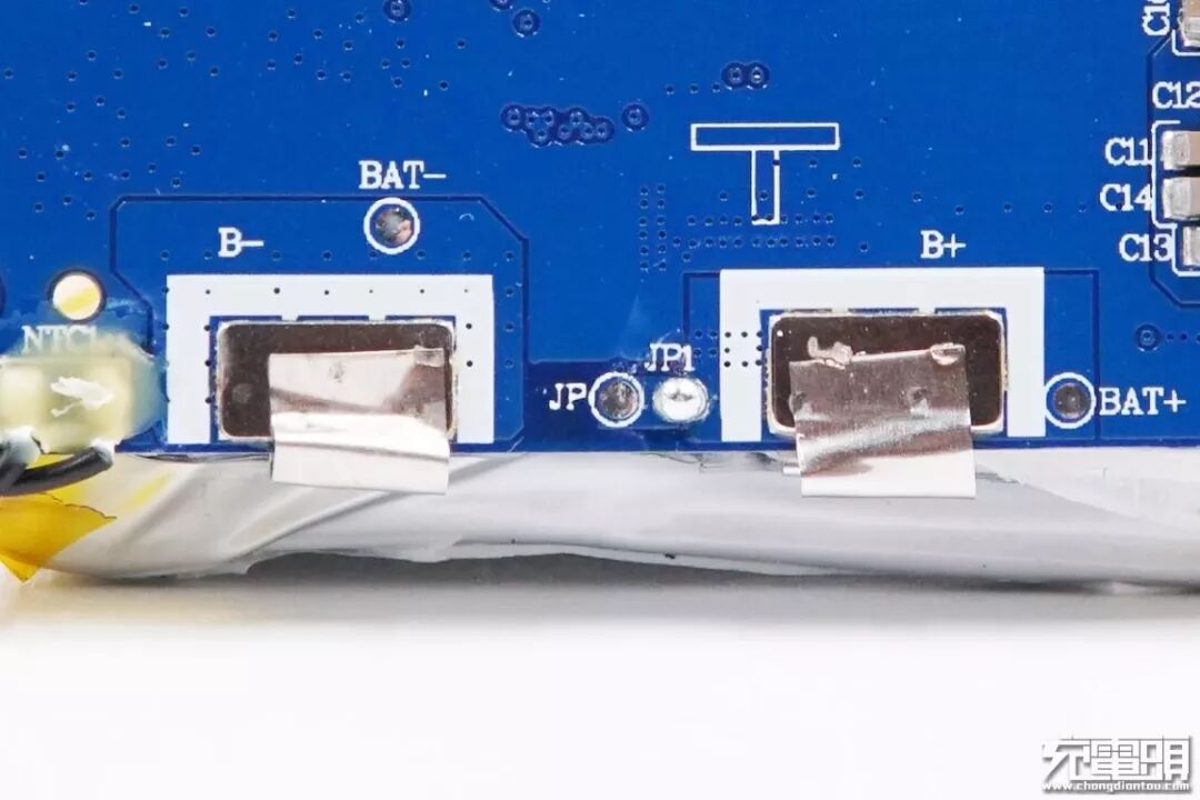 PCB板背面只有几颗电容电阻,板子使用三颗螺丝进行固定,电路板和电芯通过焊片点焊连接。