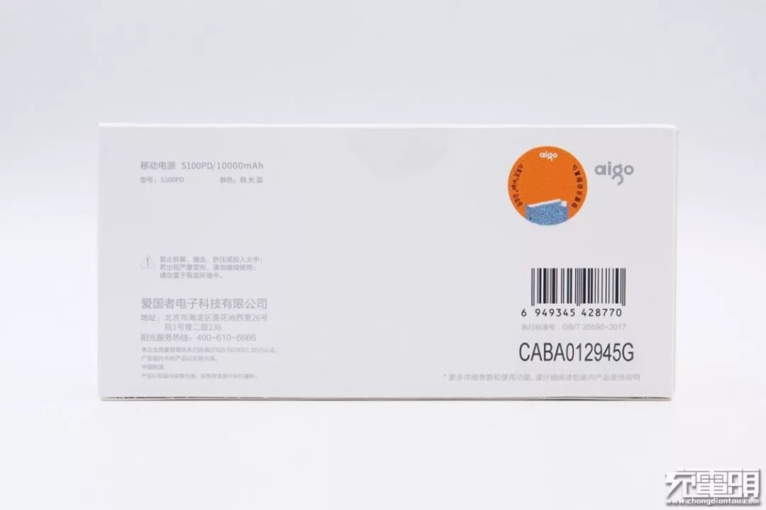背面印有产品名称、型号S100PD、颜色(极光蓝)和公司基本信息等。