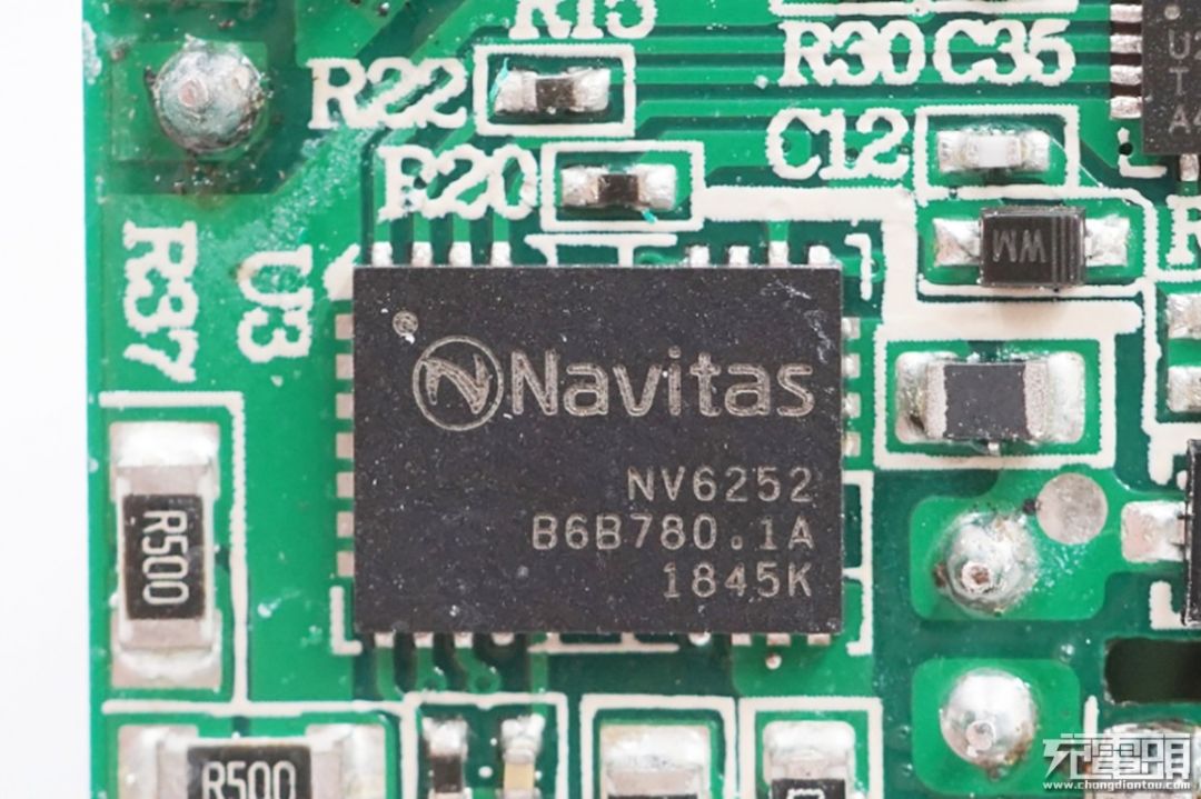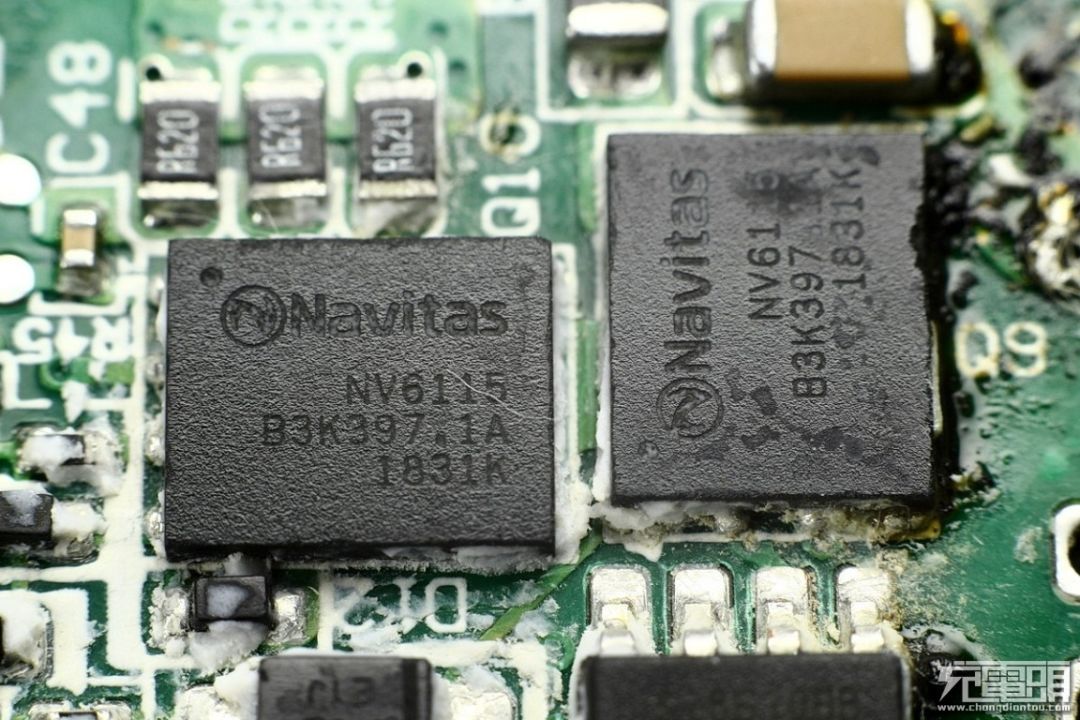 用料方面,充电头网拆解发现,产品内部采用了行业前沿的GaN氮化镓技术,内置Navitas纳微半导体的NV6115和NV6117氮化镓芯片,高度集成的驱动电路和单晶片的设计使得氮化镓芯片的开关频率大幅度提高,最终实现产品的小型化和高效率。