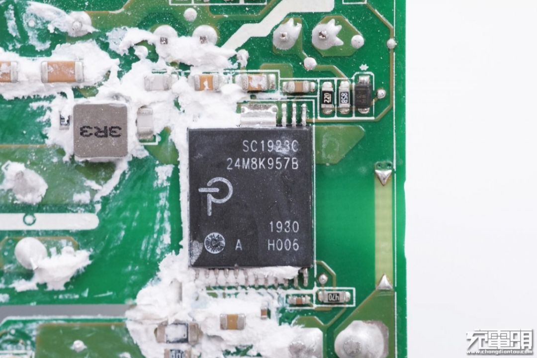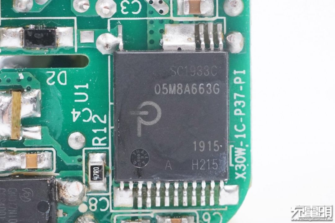 通过拆解发现,充电器内部元器件穿插布置,采用两块平行电路板之间加一块小板的结构,使得空间利用率极高,并且巧妙的设计了塑料绝缘支架,为充电器提供绝缘和支撑,使充电器更加稳固。采用PI InnoGaN一体化芯片SC1933C,大大简化充电器设计,同时得益于其高频高效的特性,所以30W的输出功率也无需辅助散热,进一步节约了空间。输出采用同步整流,减低温度提高效率,电路板内层大面积敷铜,帮助导热和散热。产品的用料讲究、设计巧妙、做工精细,满满黑科技。