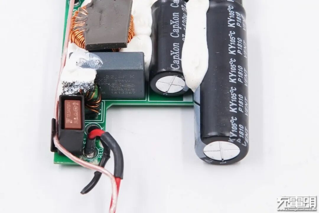输入端上延时保险丝外套有黑色塑料壳,有一颗共模电感上还贴有灰褐色导热垫,两颗电解电容横置在板子上以节省空间。