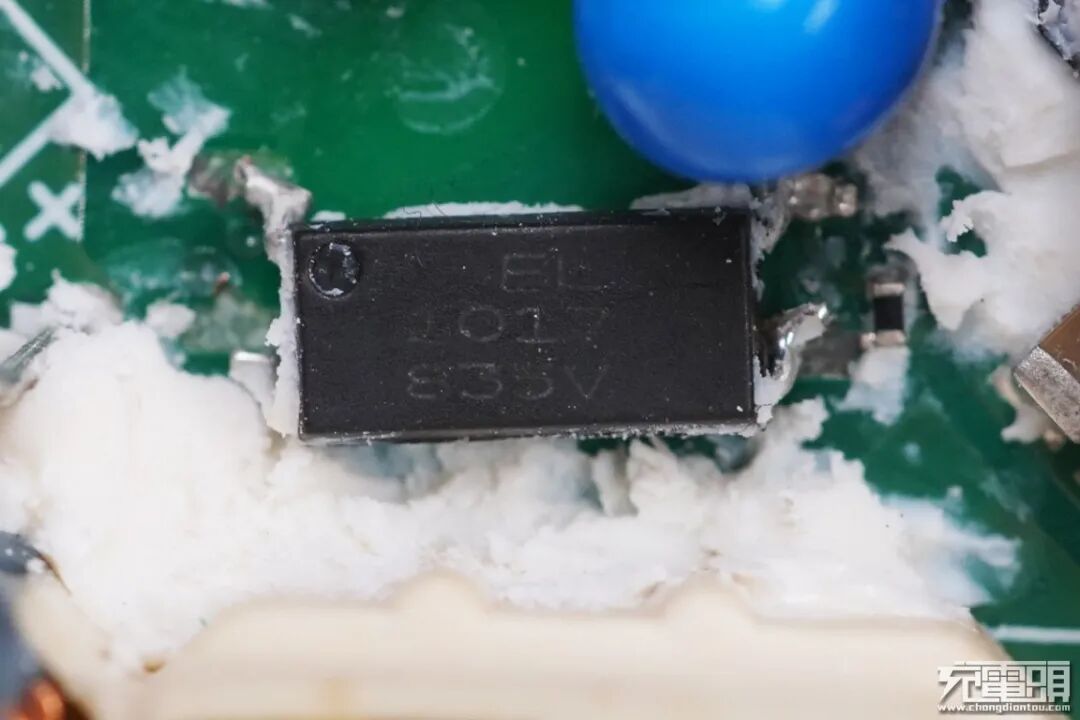 Y电容旁边是亿光EL1017光耦,横跨在初级和次级之间,用于初级次级通信,调节反馈输出电压。