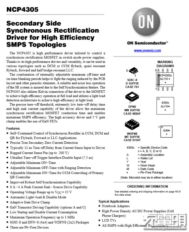 安森美 NCP4305,同步整流控制器,采用DFN封装,最高工作频率达1MHz。