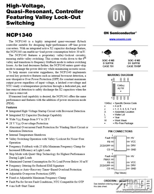 安森美 NCP1340 详细资料。充电头网了解到,采用安森美主控芯片的产品还有小米GaN充电器Type-C 65W、小米65W 2A1C三口快充充电器、小米90W USB PD快充充电器、三星美版15W原装AFC快充充电器、SlimQ 65W氮化镓USB PD快充充电器等。