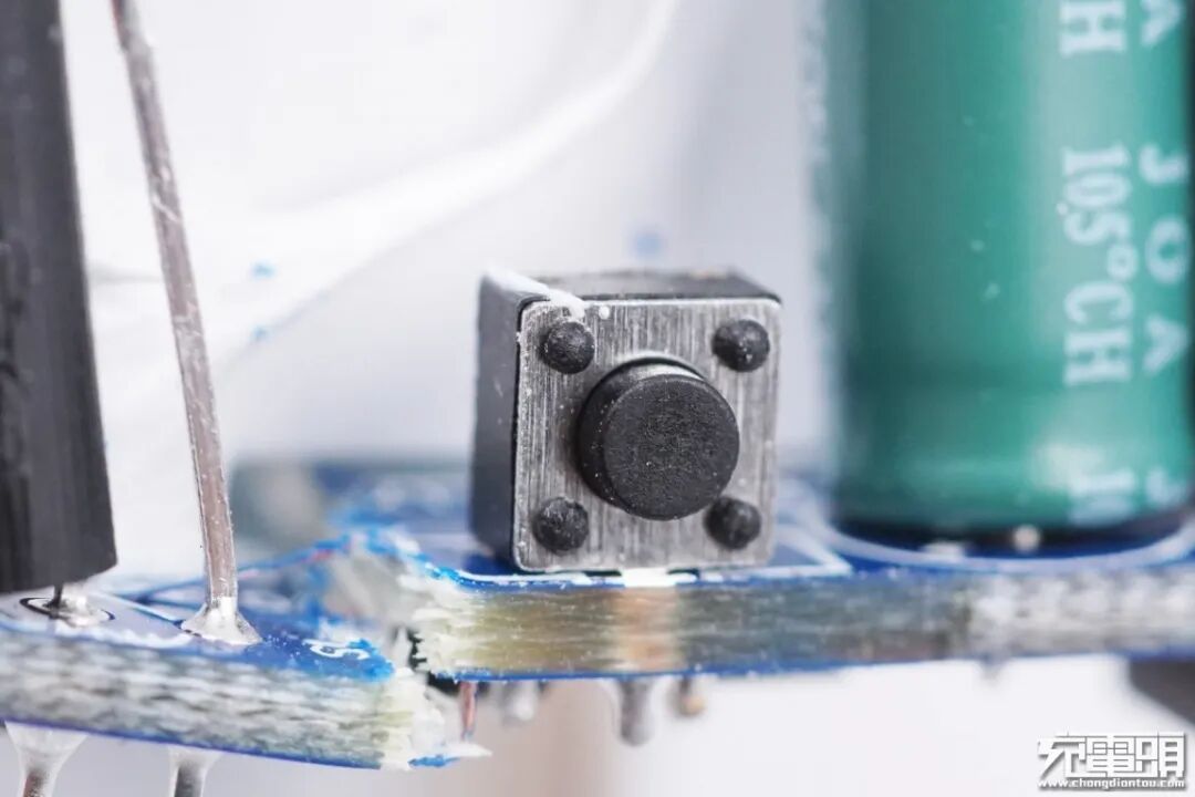 这一侧焊接一颗电解电容、电源控制开关和LED指示灯。