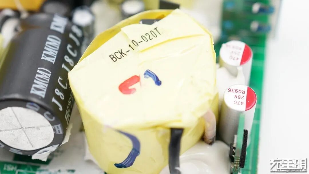 两颗输出抗干扰蓝色Y电容,之间使用黑色绝缘板进行隔离。