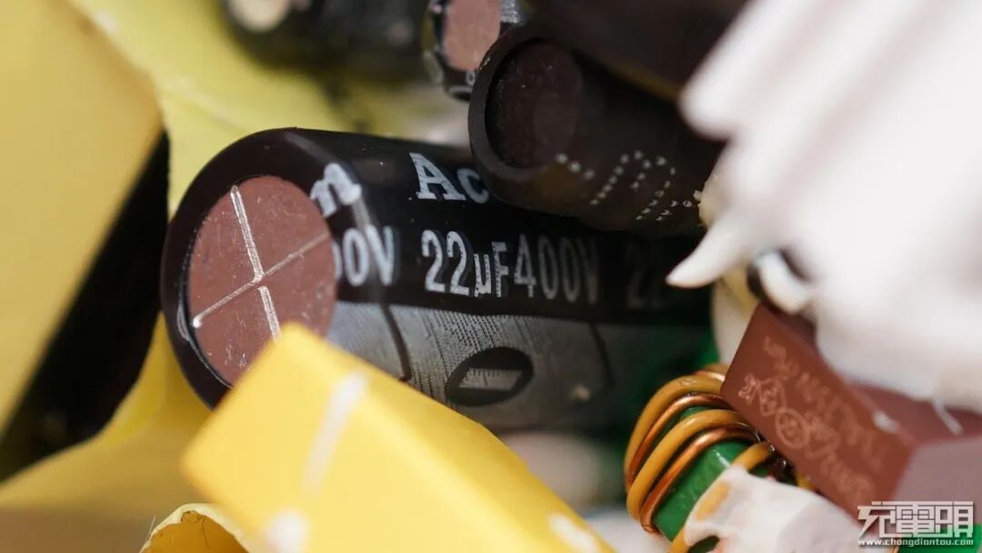 初级滤波电解电容特写,规格为400V 22μF,Acon中元品牌。