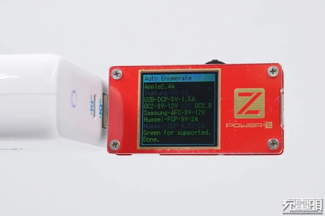 使用ChargerLAB POWER-Z KT001C检测发现USB-C口支持Apple 2.4A、USB-DCP和QC2.0/3.0协议。