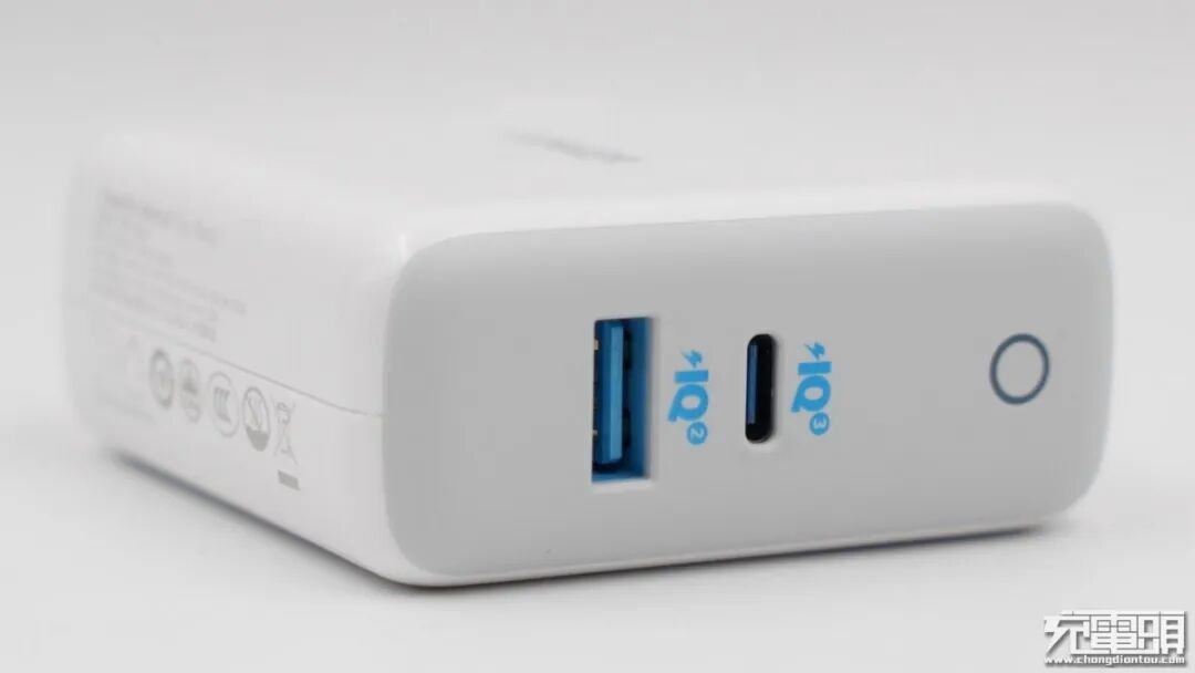 输出端配有1A1C两个接口,接口舌片均为安克蓝色,而且接口旁边分别印有IQ3和IQ2蓝色字样。此外在输出面板上方部位有一颗环形电源指示灯。