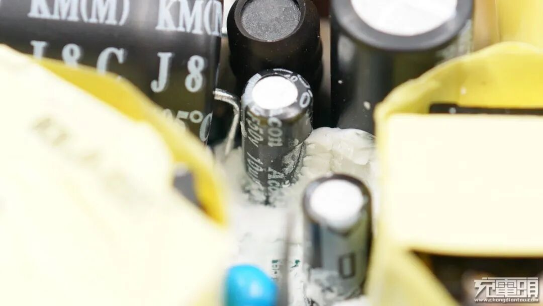 两颗PWM主控芯片供电电容,C口电路的供电电容规格为50V 10μF,Acon品牌。
