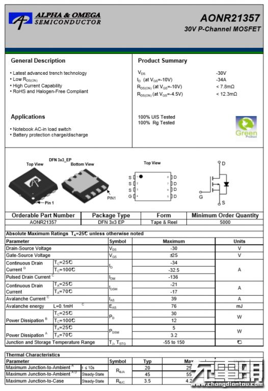 美国万代AOS AONR21357 PMOS管,耐压30V。