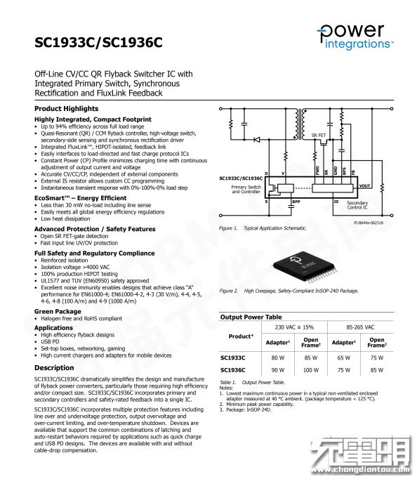 PI SC1933C无需外围元件即可提供精确的恒压/恒流/恒功率,并轻松与外接快充协议接口IC协同工作,因此适用于高效率反激式设计。