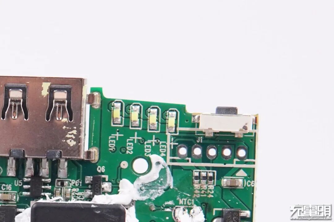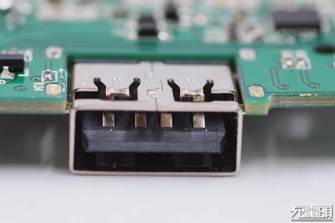 PCB上的电感、电容、PCB板固定螺钉的位置均有注胶加固,USB-A接口使用黄色马拉胶带包裹,防止异物灰尘进入移动电源内部。