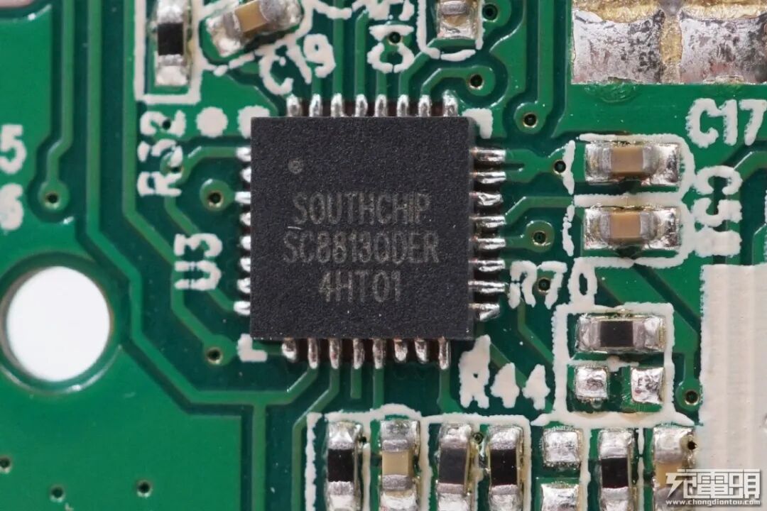 从PCB板背面可以看到,电芯通过两根镍带与PCB板焊接。PCB板上设有左侧为移动电源升降压控制器,右侧为USB-C接口双向快充的协议识别芯片,PCB背面有大面积露铜,增加散热。