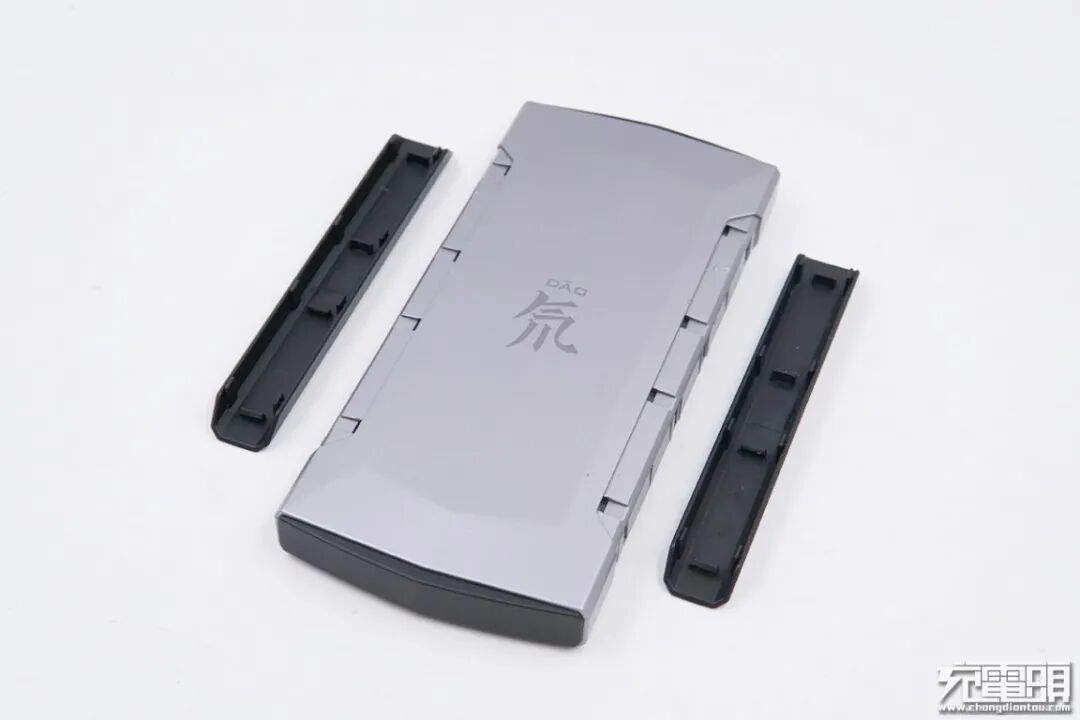 这款移动电源的外壳形状较常规移动电源而言更复杂,采用多个略微倾斜的平面组成,其主体部分为银灰色,正面居中丝印着一个大大的“DAO 氘”,四个侧面均镶嵌了黑色边框。