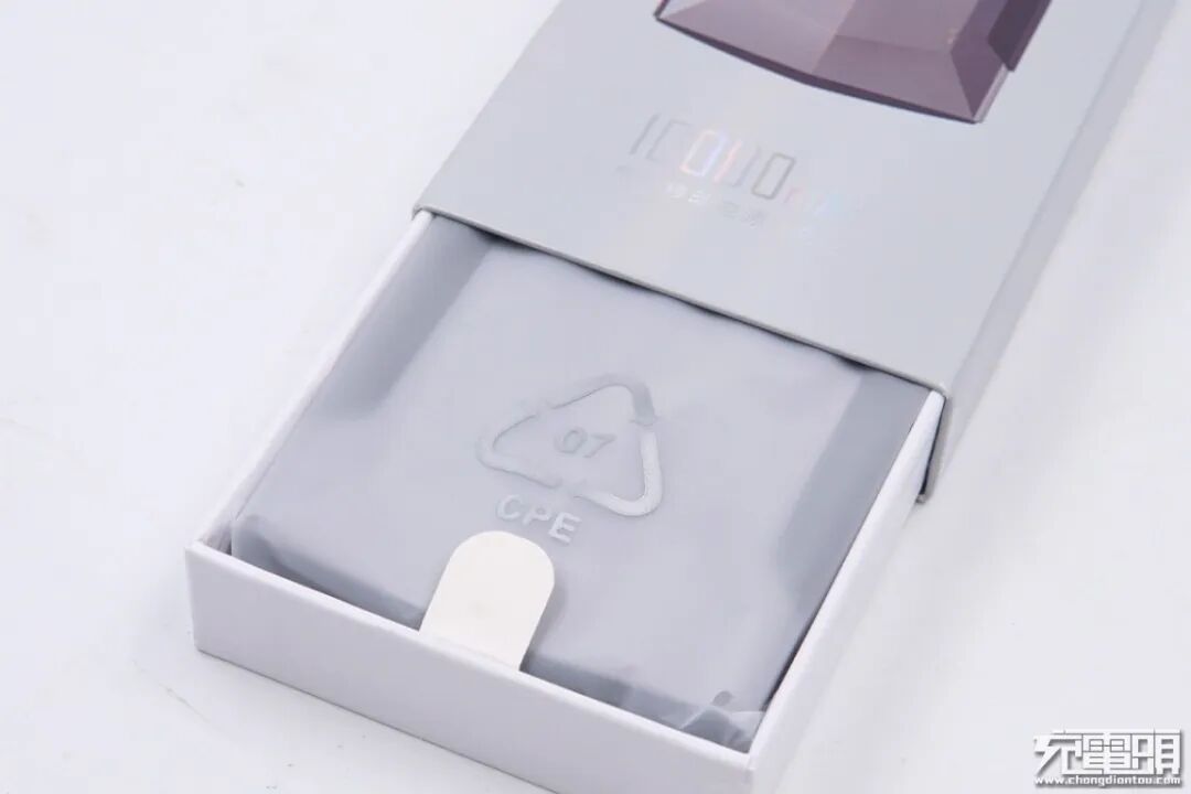 包装盒为抽拉式设计,设有一个提手方便将移动电源取出,移动电源则使用防尘袋包裹。