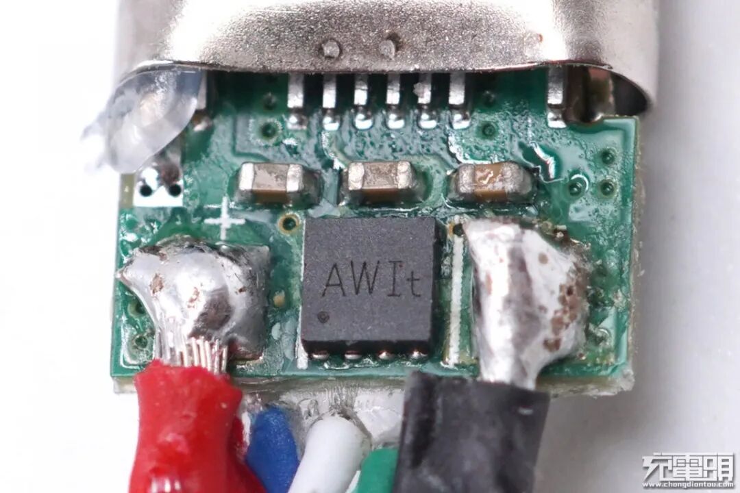 这颗E-marker芯片丝印AWIt。充电头网经了解得知,该芯片为易冲半导体的CPS8820,是一颗用于USB TYPE-C无源线缆的电子标签芯片,该芯片具有外围成本低,能满足线缆接口紧凑布局的特点。该芯片通过支持 VDM Discover Identity 命令,具有标记线缆载流能力、数据传输性能、供应商信息等特性的能力。