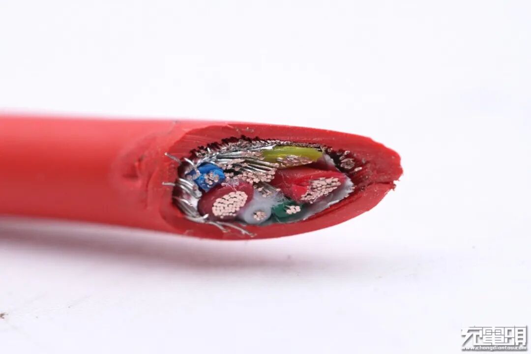 线材部分,通过特写可以看到,两根较粗的红色线缆为正极,外围镀锡铜线为负极,其余的细线为信号线。
