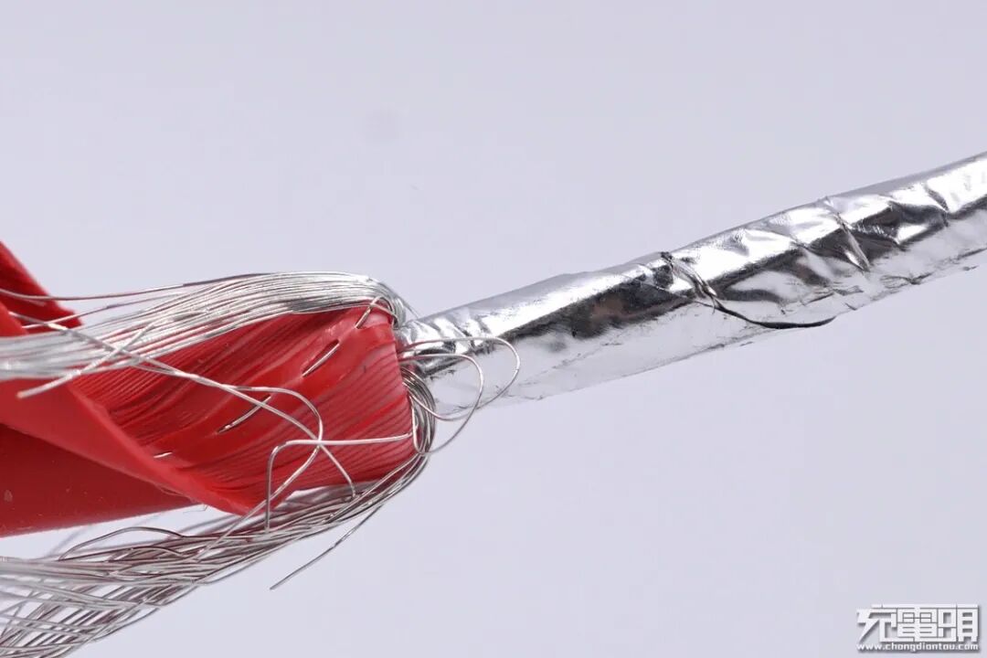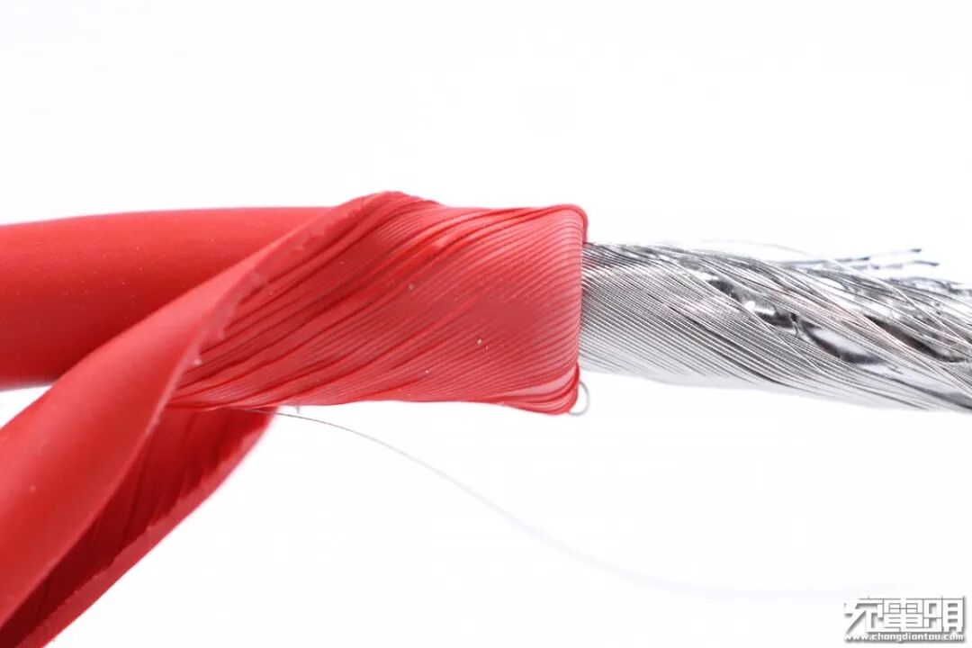 继续拆开努比亚红魔100W数据线的另一端,“L”型转角处使用铜箔进行全包裹屏蔽,“L”型连接器不仅可以让用户在边充电边玩手机的体验更佳,而且铜箔还增大了散热面积,辅助散热,降低手机端连接器在大电流快充时的温升。
