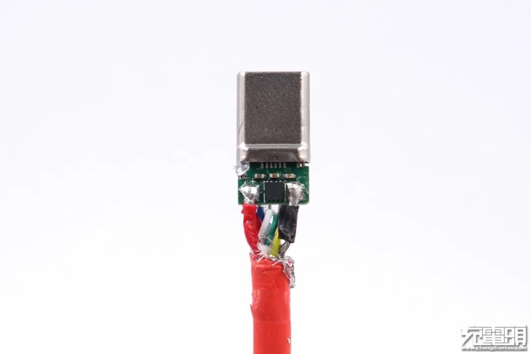 去除硬胶,PCB板正中间为E-Marker芯片,两侧较粗的为电力线缆。
