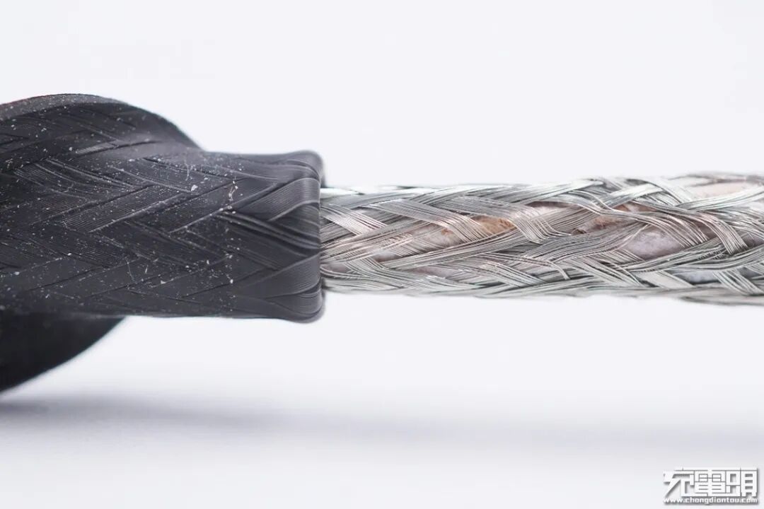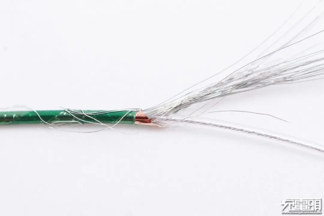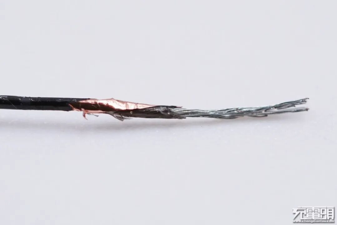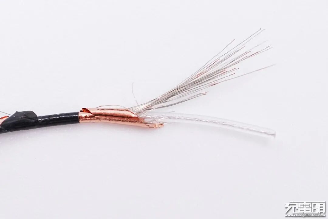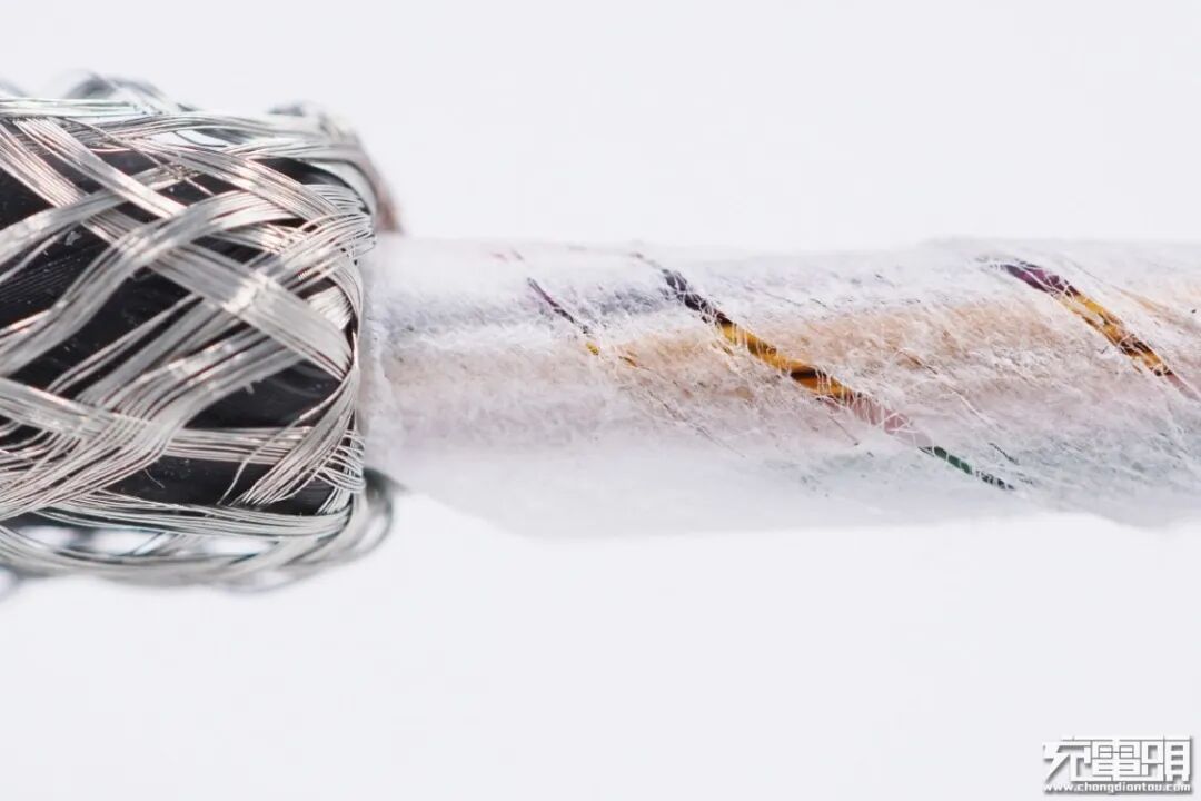 线材部分一览,从上到下分别是TPE黑色外皮、金属屏蔽网、绝缘白纸、内部的数根线芯。