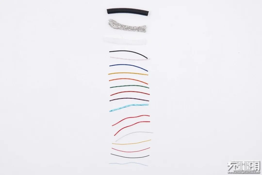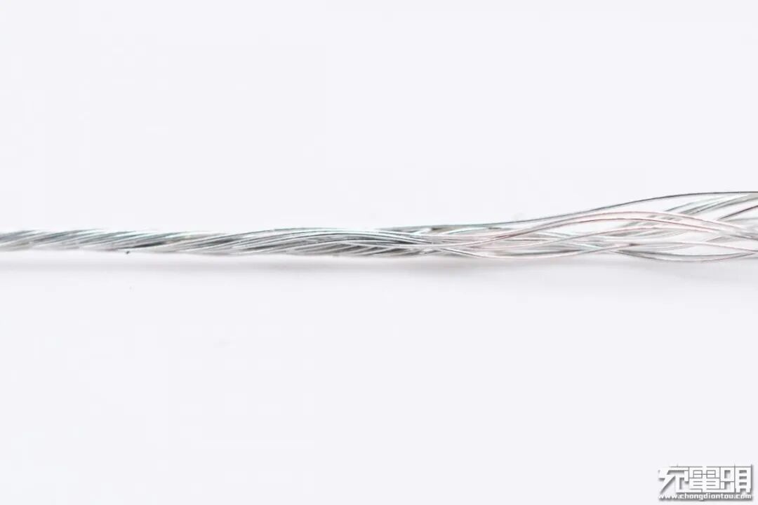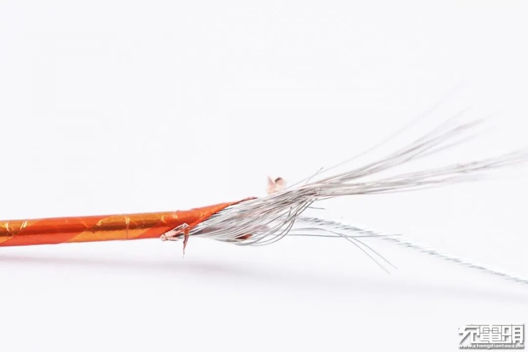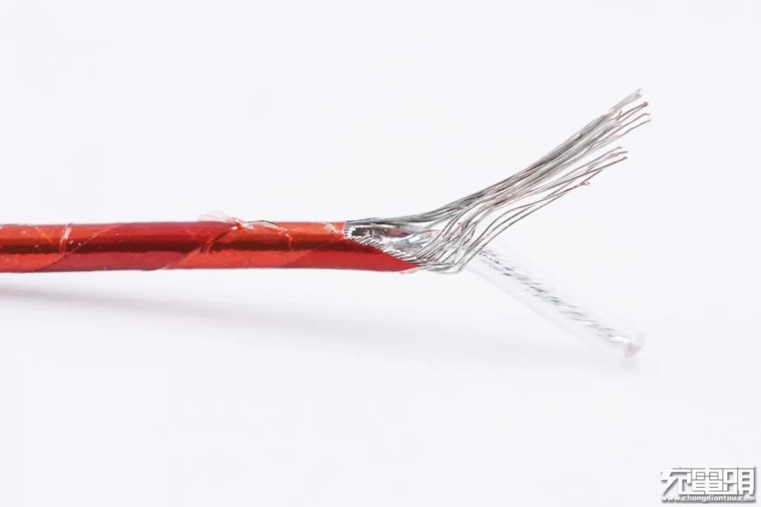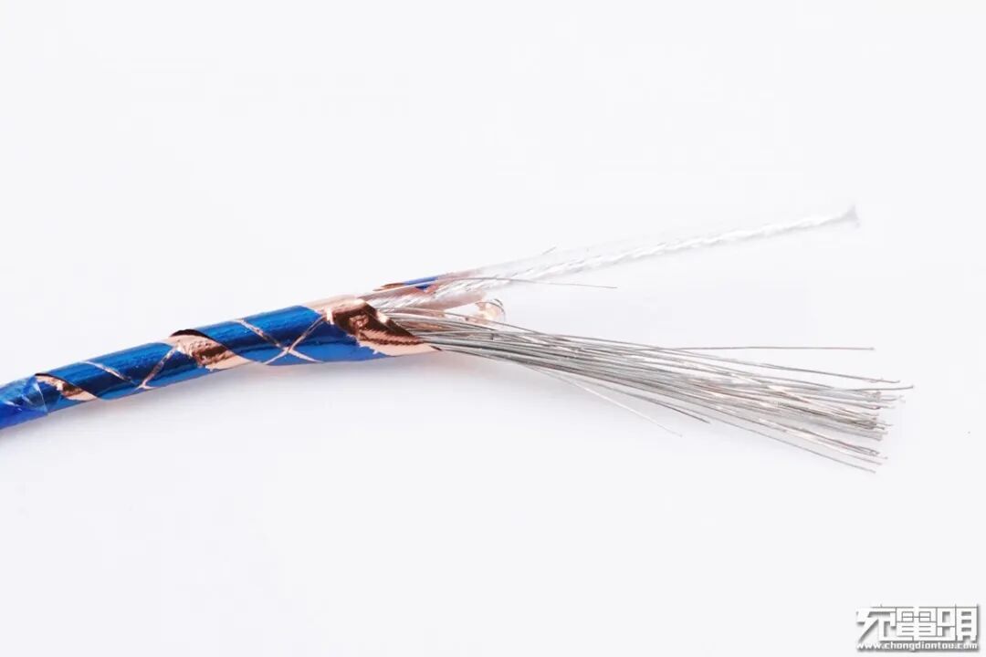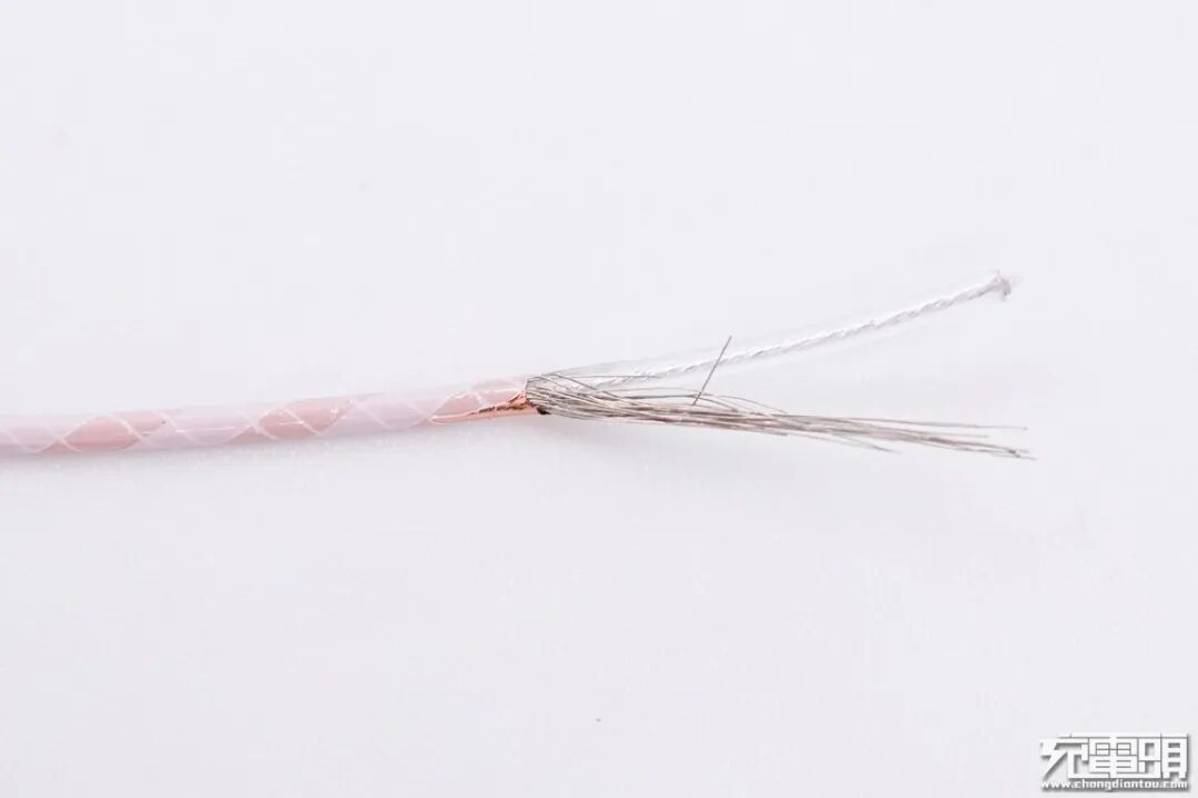 线材部分一览,从上到下分别是TPE黑色外皮、金属屏蔽网、绝缘白纸、内部的数根线芯。