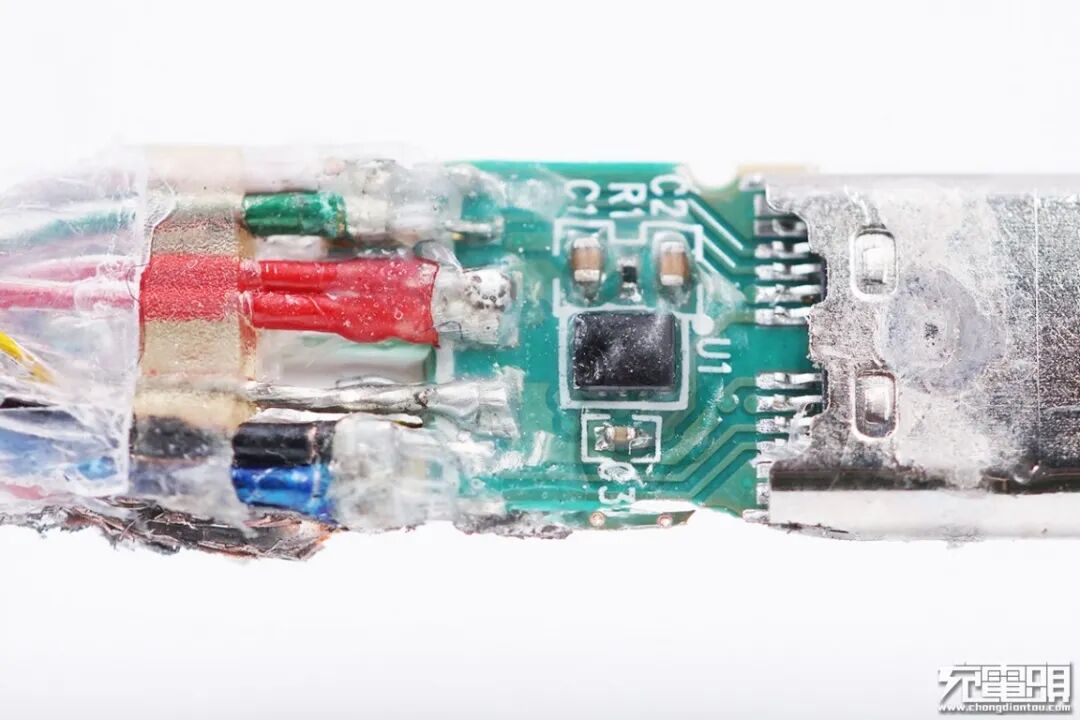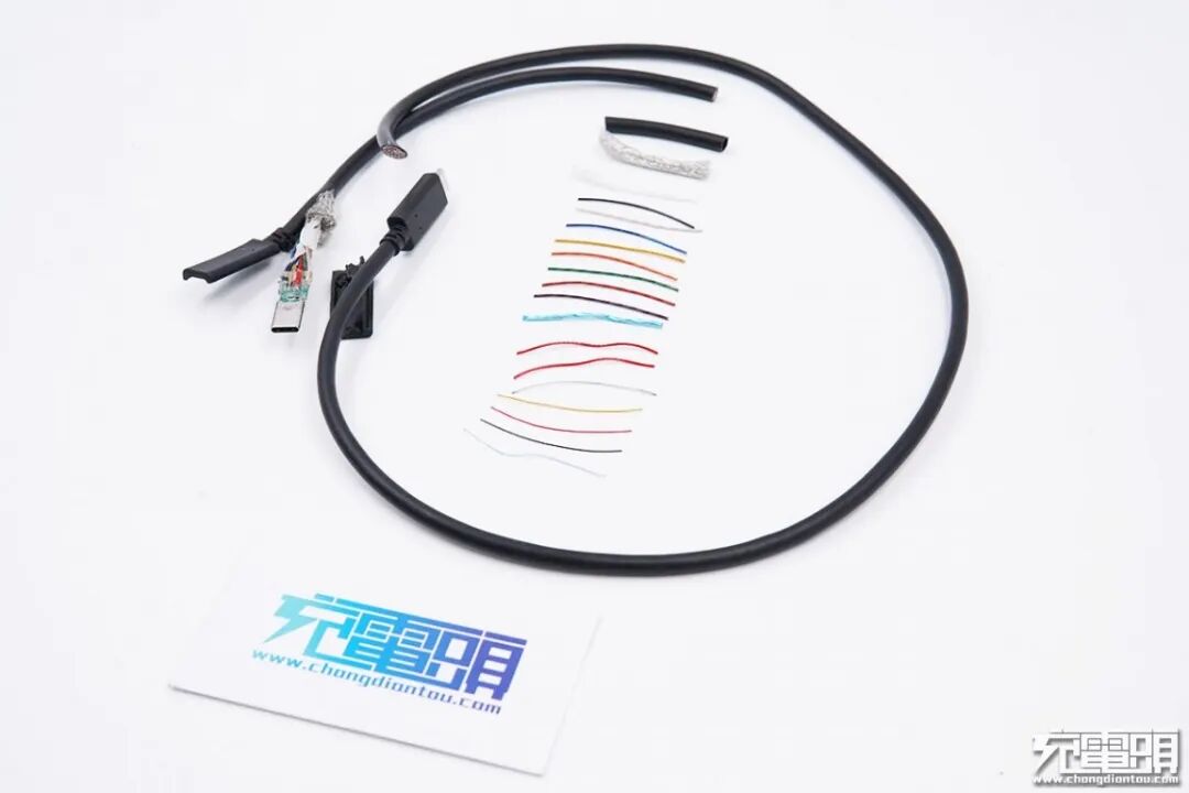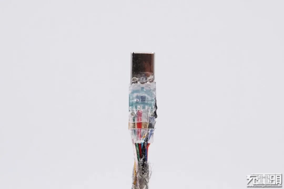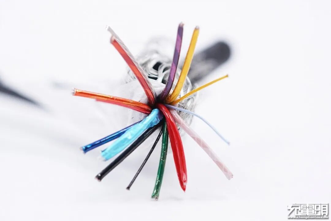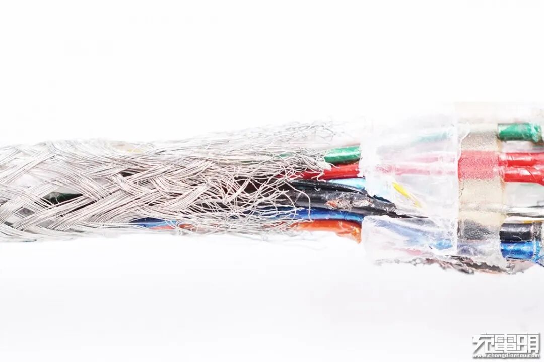 充电头网通过拆解发现,这根数据线插头塑料外壳下面使用一体钢套进行加固保护,PCB板上注塑进行填充,E-Marker芯片上二次注塑,线芯焊点饱满。此外粗壮的线身里足足有17根线芯,除了外层使用了金属屏蔽网之外,数据线芯也都设有屏蔽网和铜箔,抗干扰能力非常强,整根线缆制作工艺相当高,经久耐用。