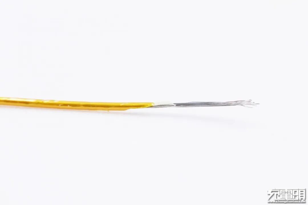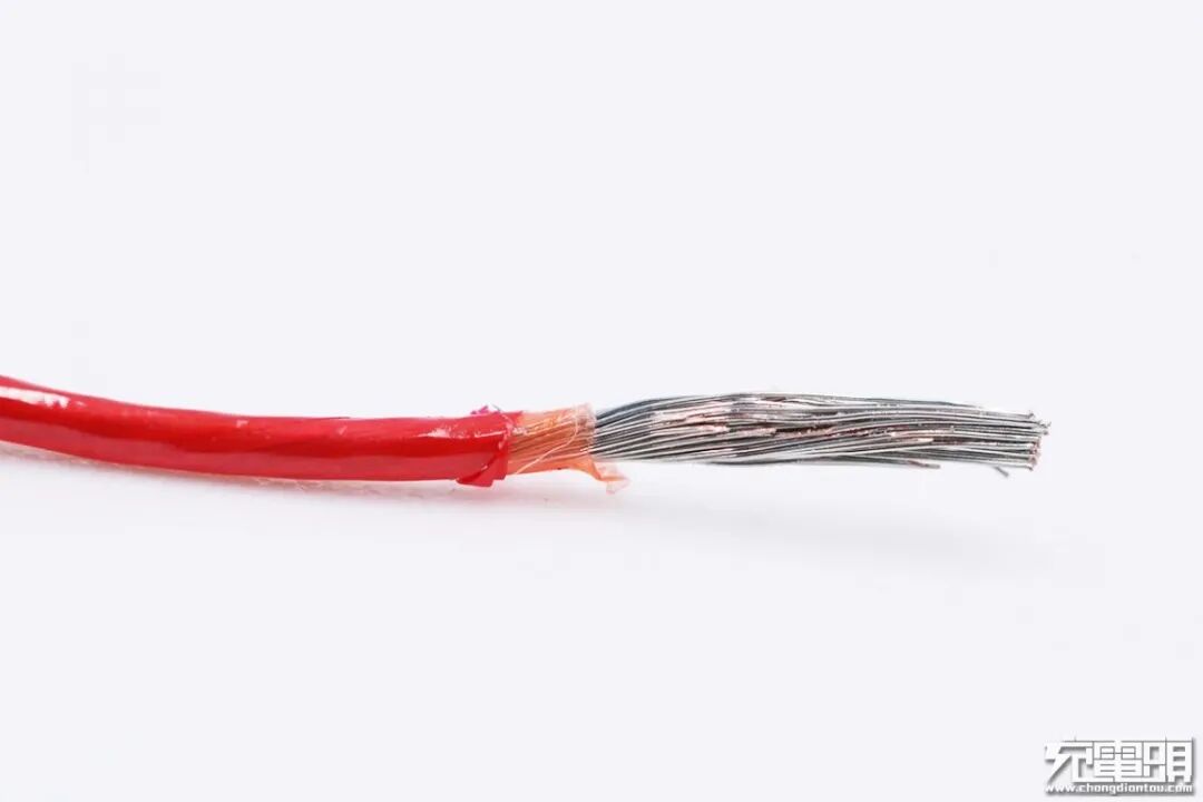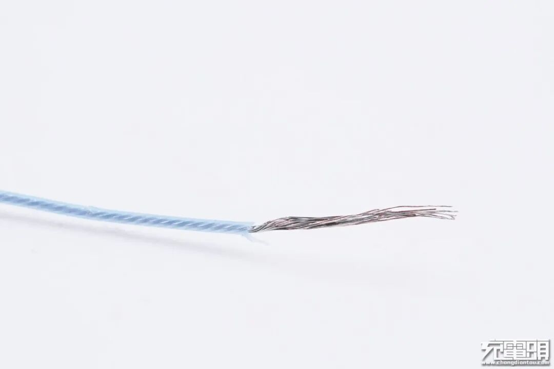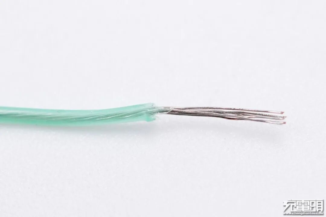 再来看一下线材的横截面,外皮很薄,内部是很多根粗细不一的线芯,而且可以很直观的看到每根线芯的线径大小。